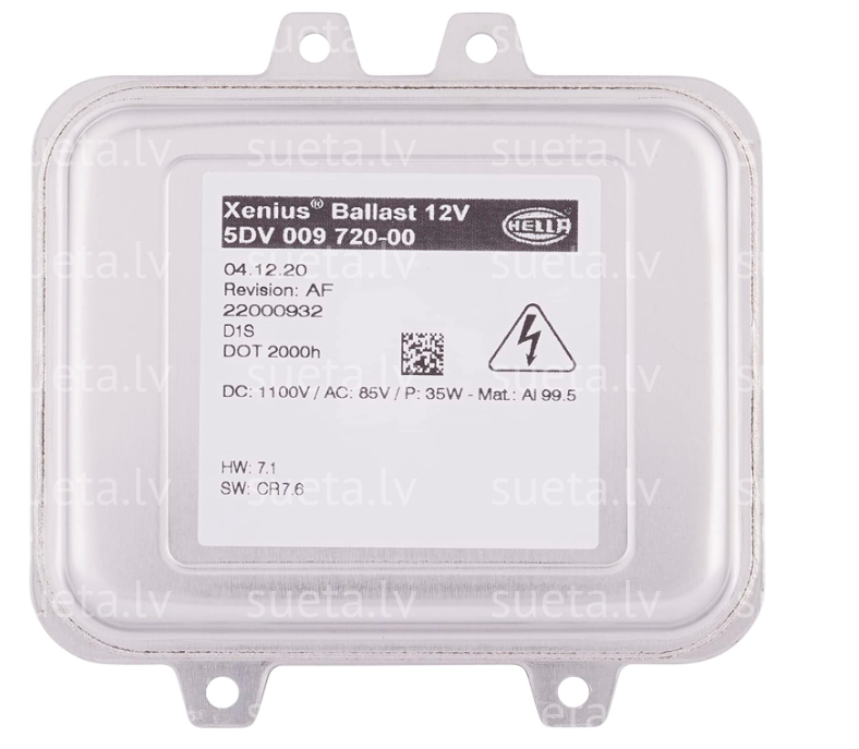 Hella 5DV 009 720-10 ksenona balasta 12V lukturu vadības bloks12V 5DV 009 720 10 D1S DOT 2000h DC:1100V / AC: 85V /P: Al 99.5 HW:7.1 SW: 7.8Novietojums transportlīdzeklī - pa kreisi/ pa labi